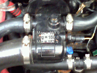 Finding hot spots on engines has never been easier. Our thermal imaging allows the entire engine to be recorded with only 2 or 3 thermal photos. Each photo records 72,000 pixels, each with a unique and accurate temperature designation. Our software allows us to easily record and detail problem areas on the engine and appurtenances. Heat exchangers can be scanned for blockage problems, injector problems can be detected early and a variety of other early detection findings can be sighted from the same images. The following 2 sets of photos depict a view of a marine engine under full load at sea trial and a heat exchanger scan.